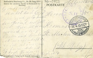 Karte im Querformat. Auf der Vorderseite: Schwarz/weiß Fotografie einer zerstörten Kirche. Auf der Rückseite: aufgedruckt: "Schlacht b. Saarburg i. L., 18.-20. Aug. 1914 / Inneres einer zerstörten Kriche in Hochwalsch bei / Saarburg / Postkarte", unten: "Originalaufn. u. Verlag von Fr. Knecht, Saarburg L.", Stempel: "(...) S.B. (...)", "Feldpostexpedition / DER / 11. 4. 15. 11-12 V / XIX. / Ersatz-Division", Adressat: "Herrn / Kosmas Schultz / St. Martin (...) / (Rh. Pfalz)" sowie handschriftlicher Text. Transkription: "Gruss aus Frankreich / sendet euch Mich. / Wir sind jetzt hinter der Frond (sonst) gehts / gut. Hier ist ein wehnich anders / Essen und Trinken ist (massenhaft nix). / Es ist schöner wie daheim. Adr. ist 19. Erst. Division (...)Landwehr Inf. Regt. N. 4 (...)". Im Historischen Museum der Pfalz war vom 29.4.2014 bis 24.9.2017 die Ausstellung "1914 - 1918. Die Pfalz im Ersten Weltkrieg" zu sehen. Auf einen öffentlichen Aufruf hin meldeten sich zahlreiche Privatpersonen, ihre Objekte wurden in dieser Sammlung erfasst und z. T. auch in der Ausstellung gezeigt. Die Objekte befinden sich im Eigentum der Privatpersonen und sind nicht Teil der Sammlungen des Historischen Museums der Pfalz.