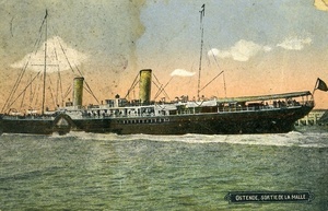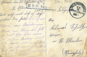 Karte im Querformat. Auf der Vorderseite: Farbige Abbildung eines Dampfers, Text: "Ostende, Sortie de la Malle [Aufbruch der Malle in Ostende]". Auf der Rückseite: Stempel 1: Feld-Postexped / K.B. / III. / Infant.-Division / 23/(9)", Stempel 2: "(S. B. / III. B. 18. bay. I. R.)", Adresse: "An / Kosmas Schultz / Winzer / in St. Martin / (Rheinpfalz)" sowie handschriftlicher Text. Transkription: "Feldpost / Ostende den 20. September 1915 / L. Eltern / Teile euch mit daß ich noch / gesund bin, heut bin ich in / Ostende, wir badeten eine / Stunde im Meer das hat / ihr mel sehen sollen wenn / die Wellen kamen, um 3 / Uhr fuhren wir nach Brü / ge das ist eine schöne Stadt. / Brief folgt. Es grüßt euch bestens / Jakob / Gruß an (Selma)". Im Historischen Museum der Pfalz war vom 29.4.2014 bis 24.9.2017 die Ausstellung "1914 - 1918. Die Pfalz im Ersten Weltkrieg" zu sehen. Auf einen öffentlichen Aufruf hin meldeten sich zahlreiche Privatpersonen, ihre Objekte wurden in dieser Sammlung erfasst und z. T. auch in der Ausstellung gezeigt. Die Objekte befinden sich im Eigentum der Privatpersonen und sind nicht Teil der Sammlungen des Historischen Museums der Pfalz.