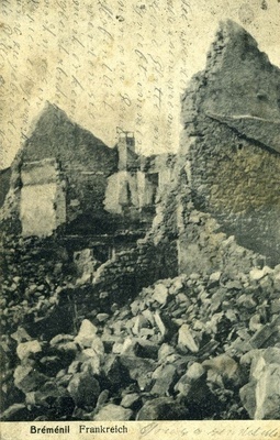 Karte im Querformat. Auf der Vorderseite: Schwarz/weiß Aufnahme einer Ruine eines Wohnhauses, Text: "Bréménil Frankreich", handschriftlicher Text. Auf der Rückseite: Stempel: "Masch.-Gew.-Komp. / Bay. Landw.-Inf.-Regis. Nr. 4 / S. B.", Adresse: "Herrn / Kosmas Schultz / Winzer / in St. Martin / (Pfalz)" sowie handschriftlicher Text. Transkription "10. 1915 (...)" Im Historischen Museum der Pfalz war vom 29.4.2014 bis 24.9.2017 die Ausstellung "1914 - 1918. Die Pfalz im Ersten Weltkrieg" zu sehen. Auf einen öffentlichen Aufruf hin meldeten sich zahlreiche Privatpersonen, ihre Objekte wurden in dieser Sammlung erfasst und z. T. auch in der Ausstellung gezeigt. Die Objekte befinden sich im Eigentum der Privatpersonen und sind nicht Teil der Sammlungen des Historischen Museums der Pfalz.