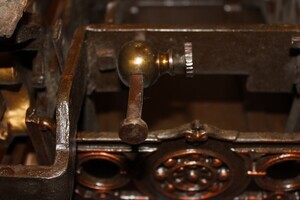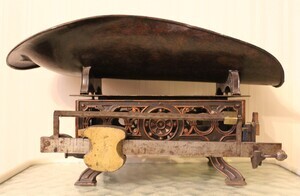 Säuglingswaage als Laufgewichtswaage mit 2 Gewichten aus Gußeisen, Gründerzeit, kein Firmenstempel. Die Waage ist technisch gesehen eine oberschalige Laufgewichtswaage. Laufgewichtswaagen sind asymmetrische Balkenwaagen. Dieses seit der römischen Schnellwaage bekannte Prinzip wurde in den Laufgewichts-Brückenwaagen weiterentwickelt. Mittels Verschieben der Gewichte auf der mit einer Messskala ausgestatteten Brücke kann das Gewicht des Wiegeguts ermittelt werden. Die Waage ist dann im Gleichgewicht, wenn der rechts an der Brücke angebrachte Marker auf gleicher Höhe wie der an der Waage fest angebrachte Marker ist. Die Waage ist eine frühes Exemplar ihres Typs. Sie steht auf vier Füßen und besitzt einen kunstvoll verzierte Korpus aus Gusseisen. Die beiden Schienen für das große und kleine Gewicht sind übereinander angebracht,. Die Laufgewichte sind aus Messing. Es existiert kein Ziffernblatt; die Gewichtsanzeigen sind auf der jeweiligen Schiene eingraviert. Die große Schiene besitzt Gewichtsanzeigen für jedes kg von 1 bis 20 kg. An jeder Gewichtsanzeige ist eine Rille in die der Zeiger, der links am großen Gewicht angebracht ist einrasten kann. Die Gewichtanzeigen der kleinen Schiene gehen von 0 g bis 1000 g. Alle 100g ist ein Strich und alle 500g ist die passende Zahl angebracht. Auf dem Korpus der Waage licht eine Schale in die das Baby für den Wiegevorgang gelegt werden kann.