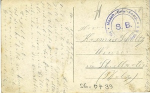 Fotografie hier verwendet als Feldpostkarte im Querformat. Auf der Vorderseite: Schwarz/weiß Gruppenporträt von fünf Soldaten in Winterausrüstung. Lammfellmäntel mit Fellseite nach innen. Drahtlöseraufnahme (siehe den Drahtauslöser in der linken Hand des mittleren Soldaten). Kontaktabzug vom Glasplattennegativ. Auf der Rückseite: Stempel: "Masch.-Gew.-Komp. / bay. (...) Regts. Nr. 4 / S. B.", Adresse: "Herrn / Kosmas Schultz / Winzer / in St. Martin / (Pfalz)" sowie handschriftlicher Text. Transkription: "26. 11. 1915 / L.[iebe] Eltern / Teile mit dass mir Holland / getel [Bedeutung unklar, vielleicht Frauenname: Gretel Holland?] schon 3 mal geschrieben / hat. Ich habe jedes mal Atw. [Antwort] / geschrieben. Sie freut sich / alle mal wenn ich Bilder / schicke. auch die Vorsteher / rihn // Es geht gut. / Ich denke bald zu kommen / alles andere mündlich. / Gruss sendet Mich. [ael]". Im Historischen Museum der Pfalz war vom 29.4.2014 bis 24.9.2017 die Ausstellung "1914 - 1918. Die Pfalz im Ersten Weltkrieg" zu sehen. Auf einen öffentlichen Aufruf hin meldeten sich zahlreiche Privatpersonen, ihre Objekte wurden in dieser Sammlung erfasst und z. T. auch in der Ausstellung gezeigt. Die Objekte befinden sich im Eigentum der Privatpersonen und sind nicht Teil der Sammlungen des Historischen Museums der Pfalz.