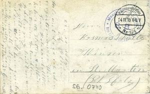 Karte im Querformat. Auf der Vorderseite: Schwarz/weiß Porträt eines voll ausgerüsteten Soldaten. Auf der Rückseite: Stempel 1: "Masch.-Gew.-Komp. / bay. (...) Regts. Nr. 4 / S. B.", Stempel 2: "(...)poststation / Nr 124 a. / 24.11.15 11-12 V", Adresse: "Herrn / Kosmas Schultz / Winzer / in St. Martin / (Pfalz)" sowie handschriftlicher Text. Transkription: "22. 11. 1915 / L. Eltern / Teile mit dass ich schon / vorgestern wieder Ware / von Frau Kaluza erhallten / habe. (...) Jakob is ganz leicht verwundet. / Es geht uns gut. / Mit dem Urlaub kanns (...) / ganz schnell gehen. kann aber / auch Weinachten werden. / der Wein hat gut geschmeckt Gruss M." Die Nachricht auf der Rückseite bezieht sich an dieser Stelle auf den Erhalt von Ware durch die Drogerie F. Kaluza in Edenkoben, welche Artikel des photographischen Bedarfs führte. Im Historischen Museum der Pfalz war vom 29.4.2014 bis 24.9.2017 die Ausstellung "1914 - 1918. Die Pfalz im Ersten Weltkrieg" zu sehen. Auf einen öffentlichen Aufruf hin meldeten sich zahlreiche Privatpersonen, ihre Objekte wurden in dieser Sammlung erfasst und z. T. auch in der Ausstellung gezeigt. Die Objekte befinden sich im Eigentum der Privatpersonen und sind nicht Teil der Sammlungen des Historischen Museums der Pfalz.