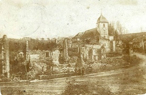 Karte im Querformat. Auf der Vorderseite: Schwarz/weiß Aufnahme eines zerstörten Dorfes. Auf der Rückseite: Stempel 1: "Masch.-Gew.-Komp. / bay. Landw.-Inf.-Regts. Nr. 4 / S. B.", Stempel 2: "K.D. Feldpoststation / Nr 124 a. / 6.12.15 3-4 N", Adresse: "Herrn / Kosmas Schultz / Winzer / in St. Martin / (Pfalz)" sowie handschriftlicher Text. Transkription: "Feldpost / (...) Mich. Schultz / 4 Ldw. 7. Regt / M.G.(W.) / Gruss / aus / (...) / sendet Euher / Mich / Es geht gut / Jakob hat auch / geschrieben". Im Historischen Museum der Pfalz war vom 29.4.2014 bis 24.9.2017 die Ausstellung "1914 - 1918. Die Pfalz im Ersten Weltkrieg" zu sehen. Auf einen öffentlichen Aufruf hin meldeten sich zahlreiche Privatpersonen, ihre Objekte wurden in dieser Sammlung erfasst und z. T. auch in der Ausstellung gezeigt. Die Objekte befinden sich im Eigentum der Privatpersonen und sind nicht Teil der Sammlungen des Historischen Museums der Pfalz.