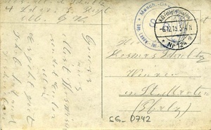 Karte im Querformat. Auf der Vorderseite: Schwarz/weiß Aufnahme eines zerstörten Dorfes. Auf der Rückseite: Stempel 1: "Masch.-Gew.-Komp. / bay. Landw.-Inf.-Regts. Nr. 4 / S. B.", Stempel 2: "K.D. Feldpoststation / Nr 124 a. / 6.12.15 3-4 N", Adresse: "Herrn / Kosmas Schultz / Winzer / in St. Martin / (Pfalz)" sowie handschriftlicher Text. Transkription: "Feldpost / (...) Mich. Schultz / 4 Ldw. 7. Regt / M.G.(W.) / Gruss / aus / (...) / sendet Euher / Mich / Es geht gut / Jakob hat auch / geschrieben". Im Historischen Museum der Pfalz war vom 29.4.2014 bis 24.9.2017 die Ausstellung "1914 - 1918. Die Pfalz im Ersten Weltkrieg" zu sehen. Auf einen öffentlichen Aufruf hin meldeten sich zahlreiche Privatpersonen, ihre Objekte wurden in dieser Sammlung erfasst und z. T. auch in der Ausstellung gezeigt. Die Objekte befinden sich im Eigentum der Privatpersonen und sind nicht Teil der Sammlungen des Historischen Museums der Pfalz.