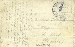 Feld- bzw. Scherzpostkarte im Querformat. Auf der Vorderseite: Schwarz/weiß Gruppenaufnahme von Soldaten, die ihre Kleidung auf Ungeziefer hin untersuchen und scherzhaft mit Waffen bedrohen. Der Fotograf nimmt hier die an der Front weitverbreitete Läuseplage aufs Korn. Auf der Rückseite: Stempel 1: "(...) Komp. (...) Regts. Nr. 4", Stempel 2: "K.D. Feldpoststation / 14.12.15 (...)", Adresse: "Herrn / Kosmas Schultz / Winzer / St. Martin (Rh Pfalz)", Absender: "(...) Mich Schultz 4 ldw. 7 R MGW" sowie handschriftlicher Text. Transkription "13. 12. 1915 / L. Elt! / Teile mit dass ich vom Hilfs- / Roten (Kreuz) Verein ein Packetchen / (...) erhalten habe. / macht die Sache von Frau Kalutze in Ordnung. Ich habe hallt noch keine / Anung wann ich (...) komm. / Urlaub bekomm ich aber wann? / das ist noch ein Rätsel / Es geht gut. / Gruss sendet Mich." Im Historischen Museum der Pfalz war vom 29.4.2014 bis 24.9.2017 die Ausstellung "1914 - 1918. Die Pfalz im Ersten Weltkrieg" zu sehen. Auf einen öffentlichen Aufruf hin meldeten sich zahlreiche Privatpersonen, ihre Objekte wurden in dieser Sammlung erfasst und z. T. auch in der Ausstellung gezeigt. Die Objekte befinden sich im Eigentum der Privatpersonen und sind nicht Teil der Sammlungen des Historischen Museums der Pfalz.