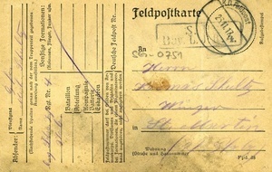 Karte im Querformat. Auf der Vorderseite: Adressvordruck, Anschrift: "Herrn / Kosmas Schultz / Winzer / St. Martin / (Rh Pfalz)", Absender: "Gefr. / Mich. Schultz / bay. Ldw. Inf. Rgt. Nr. 4 / Stab", Stempel: "K.D. Feldpost / 25.11.17". Auf der Rückseite: Datumsvordruck sowie handschriftlicher Text. Transkription: "Geschrieben den 24. 11. 1917 / Teile Euch mit daß ich / das 2. Paket und (...) / erhalten habe. Ich danke (euch) / (...). (...) (...) / Sonst gehts noch gut / auf wieder sehen / Michel". Im Historischen Museum der Pfalz war vom 29.4.2014 bis 24.9.2017 die Ausstellung "1914 - 1918. Die Pfalz im Ersten Weltkrieg" zu sehen. Auf einen öffentlichen Aufruf hin meldeten sich zahlreiche Privatpersonen, ihre Objekte wurden in dieser Sammlung erfasst und z. T. auch in der Ausstellung gezeigt. Die Objekte befinden sich im Eigentum der Privatpersonen und sind nicht Teil der Sammlungen des Historischen Museums der Pfalz.