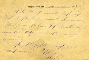 Karte im Querformat. Auf der Vorderseite: Adressvordruck, Anschrift: "Herrn / Kosmas Schultz / Winzer / St. Martin / (Rh Pfalz)", Absender: "Gefr. / Mich. Schultz / bay. Ldw. Inf. Rgt. Nr. 4 / Stab", Stempel: "K.D. Feldpost / 25.11.17". Auf der Rückseite: Datumsvordruck sowie handschriftlicher Text. Transkription: "Geschrieben den 24. 11. 1917 / Teile Euch mit daß ich / das 2. Paket und (...) / erhalten habe. Ich danke (euch) / (...). (...) (...) / Sonst gehts noch gut / auf wieder sehen / Michel". Im Historischen Museum der Pfalz war vom 29.4.2014 bis 24.9.2017 die Ausstellung "1914 - 1918. Die Pfalz im Ersten Weltkrieg" zu sehen. Auf einen öffentlichen Aufruf hin meldeten sich zahlreiche Privatpersonen, ihre Objekte wurden in dieser Sammlung erfasst und z. T. auch in der Ausstellung gezeigt. Die Objekte befinden sich im Eigentum der Privatpersonen und sind nicht Teil der Sammlungen des Historischen Museums der Pfalz.