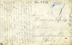 Karte im Querformat. Auf der Vorderseite: Schwarz/weiß Fotografie der zerstörten Ortschaft Xousse in Lothringen, welche von 1871 bis 1914 an der Grenze zum Deutschen Reich lag. Auf der Rückseite: Stempel: "Masch.-Gew.-Komp. / (...) / S.B.", Adresse: "Herrn / Kosmas Schultz / Winzer / in St. Martin / (Pfalz)", Absender: "Mich. Schultz (...)" sowie ein handschriftlicher Text. Transkription: "L. Eltern! / Teile mit dass ich gestern eure / Postkarten und heute den Wein / erhallten habe. Er ist gut an / gekommen. Ich habe gleich 2 / getrunken, der ist sehr gut, / das Gesuch ist im Gange. / Es kann noch Weihnachten / werden, ver (bricht) euch ganz / schnell. Es geht mir gut. / Ich möcht wissen von welchem / Christmann (...) (...) / Gruss sendet Mich.". Im Historischen Museum der Pfalz war vom 29.4.2014 bis 24.9.2017 die Ausstellung "1914 - 1918. Die Pfalz im Ersten Weltkrieg" zu sehen. Auf einen öffentlichen Aufruf hin meldeten sich zahlreiche Privatpersonen, ihre Objekte wurden in dieser Sammlung erfasst und z. T. auch in der Ausstellung gezeigt. Die Objekte befinden sich im Eigentum der Privatpersonen und sind nicht Teil der Sammlungen des Historischen Museums der Pfalz.