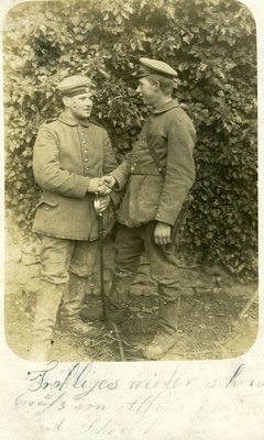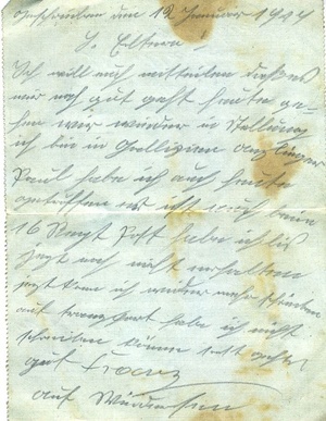 Feldpostbrief im Querformat, zum Falten. Auf der Außenseite: Stempel 1: "K(...)l. Bayr. / 91 / (...)", Stempel 2: "(...)", Anschrift: "Kosmas Schultz / Winzer / St. Martin / (Rh. Pfalz)", Absender: "Schütze Franz Schultz / 10 bayr. Inf. Division / Inf. Regt. Nr. 16 / (...) M. G. Trupp 91". Auf der Innenseite: handschriftlicher Text. Transkription: "Geschrieben den 12 Januar 1917 / L. Eltern! / Ich will euch mitteilen daß es / mir noch gut geht heute ge- / hen wir wieder in Stellung / ich bin in (Gallizien) (...linger) / Paul habe ich auch heute / getroffen er ist auch beim / 16 Regt Post habe ich bis / jetzt noch nicht erhalten / jetzt kann ich wieder mehr schreiben / auf (...) habe ich nicht / schreiben können sonst gehts / gut Franz / auf Wiedersehen". Im Historischen Museum der Pfalz war vom 29.4.2014 bis 24.9.2017 die Ausstellung "1914 - 1918. Die Pfalz im Ersten Weltkrieg" zu sehen. Auf einen öffentlichen Aufruf hin meldeten sich zahlreiche Privatpersonen, ihre Objekte wurden in dieser Sammlung erfasst und z. T. auch in der Ausstellung gezeigt. Die Objekte befinden sich im Eigentum der Privatpersonen und sind nicht Teil der Sammlungen des Historischen Museums der Pfalz.