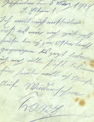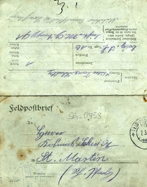 Feldpostbrief im Querformat, zum Falten. Auf der Außenseite: Stempel 1: "(...)", Stempel 2: "Feld-Pos(t) / 7.3.", Anschrift: "Herrn / Kosmas Schultz / St. Martin / (Rh. Pfalz)", Absender: "Schütze Franz Schultz / 10 bayr. Inf. Division / Inf. Regt. Nr. 16 / (...) M. G. Trupp 91", "Militär Sammelstelle (...)". Auf der Innenseite: handschriftlicher Text. Transkription: "Geschrieben den 5 März 1917 / L. Eltern! / Ich will euch mitteilen / daß es mir noch gut geht / heute bin ich zur Osterbeicht / gegangen bis jetzt habe / ich noch alle Post bekommen / für heute will ich schließen / Auf Wiedersehen / Franz". Im Historischen Museum der Pfalz war vom 29.4.2014 bis 24.9.2017 die Ausstellung "1914 - 1918. Die Pfalz im Ersten Weltkrieg" zu sehen. Auf einen öffentlichen Aufruf hin meldeten sich zahlreiche Privatpersonen, ihre Objekte wurden in dieser Sammlung erfasst und z. T. auch in der Ausstellung gezeigt. Die Objekte befinden sich im Eigentum der Privatpersonen und sind nicht Teil der Sammlungen des Historischen Museums der Pfalz.