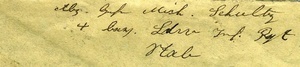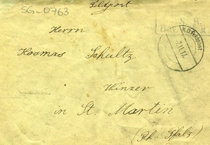 Feldpostbriefumschlag im Querformat. Auf der Vorderseite: Stempel 1: "S.B. / Bay. (...) R.", Stempel 2: "K.D.Feldpost / 7.11.17", Anschrift: "Herrn / Kosmas Schultz / Winzer / in St. Martin / (Rh. Pfalz)". Auf der Rückseite: Absender: "Gefr. Mich. Schultz / 4 bay. Ldw Inf. Rgt / Stab". Im Historischen Museum der Pfalz war vom 29.4.2014 bis 24.9.2017 die Ausstellung "1914 - 1918. Die Pfalz im Ersten Weltkrieg" zu sehen. Auf einen öffentlichen Aufruf hin meldeten sich zahlreiche Privatpersonen, ihre Objekte wurden in dieser Sammlung erfasst und z. T. auch in der Ausstellung gezeigt. Die Objekte befinden sich im Eigentum der Privatpersonen und sind nicht Teil der Sammlungen des Historischen Museums der Pfalz.