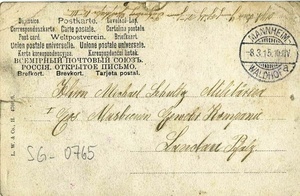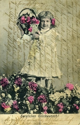 Karte im Hochformat. Auf der Vorderseite: Schwarz/weiß Fotografie eines Blumenmädchens, einzelne Blüten sind rosa koloriert, unter der Abbildung steht "Herzlichen Glückwunsch!". Der handschriftliche Text wurde über das Motiv geschrieben. Auf der Rückseite: Stempel: "Mannheim / 8.3.15 10-11V. / Waldhof a", Adressat: "Herrn Michael Schultz Militär(...) / I (...) Mashienen Gewehr Kompanie / Landau Pfalz". Im Historischen Museum der Pfalz war vom 29.4.2014 bis 24.9.2017 die Ausstellung "1914 - 1918. Die Pfalz im Ersten Weltkrieg" zu sehen. Auf einen öffentlichen Aufruf hin meldeten sich zahlreiche Privatpersonen, ihre Objekte wurden in dieser Sammlung erfasst und z. T. auch in der Ausstellung gezeigt. Die Objekte befinden sich im Eigentum der Privatpersonen und sind nicht Teil der Sammlungen des Historischen Museums der Pfalz.