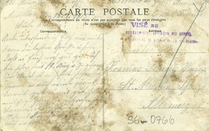 Karte im Querformat. Auf der Vorderseite: Schwarz/weiß Fotografie des Dorfbrunnens und der Schule mit Dorfbewohnern in Saint-Simon (Département Cantal) auf dem Place de l’Eglise, Beschriftung: "L’Auvergne / Cantal - 312 - Vallée de Mandailles / St-Simon, Place de l’Eglise / la Fontaine et les Ecoles". Auf der Rückseite: Stempel: "Visé au / commandement supérieur des dépots / (...)", Adressat: "Familie / Kosmas Schultz Winzer / St. Martin Pfalz / Allemagne", Absender: "Henri (...) Cantal France" sowie handschriftlicher Text. Transkription: "Aurillas, den 13. 7. 1915 / Liebe (Freunde)! / Anbei übersende ich Euch aus (...) / (...) die besten Grüße u hoffe / daß es Euch noch gut gehts. Ich / bin schon seit 19. Aug d. J. gefangen. / Euer Michel ist noch (froh), hoffentlich / kommt er auch wieder zurück. / Soweit geht es mir gut . (...) (...) (...)". Im Historischen Museum der Pfalz war vom 29.4.2014 bis 24.9.2017 die Ausstellung "1914 - 1918. Die Pfalz im Ersten Weltkrieg" zu sehen. Auf einen öffentlichen Aufruf hin meldeten sich zahlreiche Privatpersonen, ihre Objekte wurden in dieser Sammlung erfasst und z. T. auch in der Ausstellung gezeigt. Die Objekte befinden sich im Eigentum der Privatpersonen und sind nicht Teil der Sammlungen des Historischen Museums der Pfalz.
