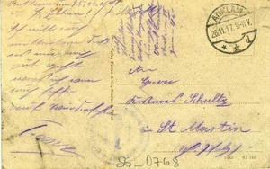 Karte im Querformat. Auf der Vorderseite: Schwarz/weiß Fotografie eines Hafens, Beschriftung: "Anklam i. Pom. - Peene-Partie". Auf der Rückseite: Stempel: "Anklam / 26.11.17 10-11 V.", Adressat: "Herrn / Kosmas Schultz / in St. Martin / (Rh. Pfalz)", Absender: "Schütze / Franz Schultz / (...) Lazarett (...)" sowie handschriftlicher Text. Transkription: "Anklam den 25. 11. 1917 / L. Eltern! / Ich will euch / mitteilen daß / es mir noch / gut geht / was ich von / euch hoffe / auf Wiedersehen / Franz". Im Historischen Museum der Pfalz war vom 29.4.2014 bis 24.9.2017 die Ausstellung "1914 - 1918. Die Pfalz im Ersten Weltkrieg" zu sehen. Auf einen öffentlichen Aufruf hin meldeten sich zahlreiche Privatpersonen, ihre Objekte wurden in dieser Sammlung erfasst und z. T. auch in der Ausstellung gezeigt. Die Objekte befinden sich im Eigentum der Privatpersonen und sind nicht Teil der Sammlungen des Historischen Museums der Pfalz.
