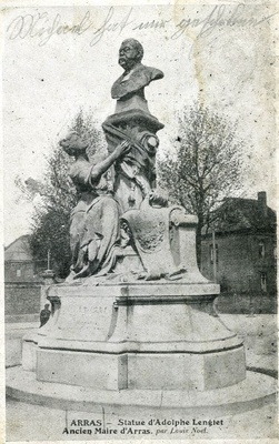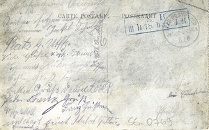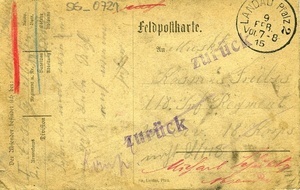 Karte im Querformat. Auf der Vorderseite: Schwarz/weiß Fotografie der Präfektur in Arras, Beschriftung: "Arras - La Préfecture", handschriftlicher Text wurde über das Motiv geschrieben. Auf der Rückseite: Stempel 1: "S.B. / III. B 18 bay. J. R.", Stempel 2: "Feld-Postexped / III. / Infant-Division / 8/8" sowie handschriftlicher Text. Im Historischen Museum der Pfalz war vom 29.4.2014 bis 24.9.2017 die Ausstellung "1914 - 1918. Die Pfalz im Ersten Weltkrieg" zu sehen. Auf einen öffentlichen Aufruf hin meldeten sich zahlreiche Privatpersonen, ihre Objekte wurden in dieser Sammlung erfasst und z. T. auch in der Ausstellung gezeigt. Die Objekte befinden sich im Eigentum der Privatpersonen und sind nicht Teil der Sammlungen des Historischen Museums der Pfalz.