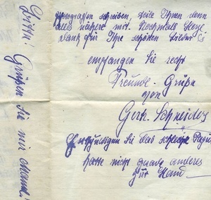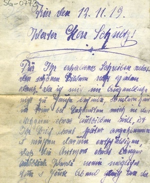 Handschriftlicher Text auf Papier, Vorder- und Rückseite beschrieben Transkription "Trier, den 12. 11. 19 / Werter Herr Schultz! / Für Ihr erhaltenes Schreiben nebst / den schönen Bildern sehr vielen / Dank. Da ich mich im Augenblicke / nicht zu Hause befinde, sondern hier / in Trier bei Bekannten mich in der / Metzgerei etwas ausbilden will, ist / Ihr Brief etwas später angekommen / & müssen daher entschuldigen, / daß die Antwort etwas länger / ausblieb. Werde mein mögliches / tun & heute Abend gleich an die / Photographen schreiben, teile Ihnen denn / alles nähere mit. Nochmals herzl. / Dank für Ihre schönen Bilder & / empfangen Sie recht / Freundl. Grüße / von / Gertr. Schneiders / Entschuldigen Sie das schlechte Papier / hatte nicht gerade anderes / zur Hand / Bitte! Grüßen Sie mir (Manne)!" Im Historischen Museum der Pfalz war vom 29.4.2014 bis 24.9.2017 die Ausstellung "1914 - 1918. Die Pfalz im Ersten Weltkrieg" zu sehen. Auf einen öffentlichen Aufruf hin meldeten sich zahlreiche Privatpersonen, ihre Objekte wurden in dieser Sammlung erfasst und z. T. auch in der Ausstellung gezeigt. Die Objekte befinden sich im Eigentum der Privatpersonen und sind nicht Teil der Sammlungen des Historischen Museums der Pfalz.