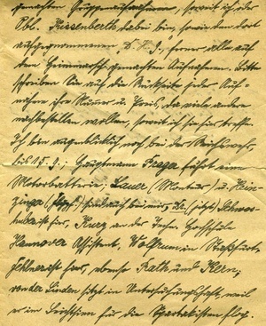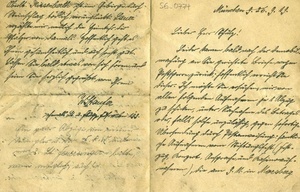 Handschriftlicher Brief an Herrn Schultz, 4-seitig Transkription "München 9. 2 [durchgestrichen] 6. 9. 19. / Lieber Herr Schulz! / Leider kamen bald nach der Demobil- / machung an Sie gerichtete Briefe wegen / (Postsperre) zurück; hoffentlich erreicht Sie / dieser. Ich möchte Sie ersuchen, mir von / allen fogenden Aufnahmen jw 1 Abzug / zu schicken, unter Nachnahme des Betrages / oder, falls solche unzulässig, gegen sofortige / Übersendung durch Postanweisung: freundli- / che Aufnahmen vom Stiftungsfest (Fest- / zug, Konzert, Ansprache und Kasinoauf- / nahmen), die am 9. 11. in Morsberg gemachten Gruppenaufnahmen, soweit ich oder Pbl. Kissenberth dabei bin, sowie den dort / aufgenommenen "D.H.G.", ferner alle auf / dem Grimmarsch gemachten Aufnamen. Bitte / schreiben Sie auf die Rückseite jeder Auf- / nahme ihre Nummer u. Preis, da viele andere / nachbestellen wollen, soweit ich sie (...) treffe. / Ich bin augenblicklich noch bei der Reichswehr, / bis 15. 9.; Hauptmann Prager fährt eine / Motorbatterie; Lauer (Monteur) Hein- / zinger (...) sind auch bei mir, Dr. (jetzt) Schwos- / huber ist hier, Kurz an der Techn. Hochschule / Hannover Assistent, Wofrum in Staßfurt, / Felner ist hier, ebenso Rath und Kern, / von der Linden sitzt in Untersuchungshaft, weil / er im Leichtsinn für die Spartakisten flog. / Oberlt. Kissenberth ist im Gebirge durch / Steinschlag tödlich verunglückt. Lauer / erzählte mir neulich die Heimkehr der / Pfälzer von damals. Hoffentlich geht es / Ihnen gesundheitlich und auch sonst gut. / Lassen sie bald etwas von sich hören und / seien Sie herzlich gegrüßt von Ihrem / W. Staufer / ehemals Lt. Flugz. (...) bei 199." Im Historischen Museum der Pfalz war vom 29.4.2014 bis 24.9.2017 die Ausstellung "1914 - 1918. Die Pfalz im Ersten Weltkrieg" zu sehen. Auf einen öffentlichen Aufruf hin meldeten sich zahlreiche Privatpersonen, ihre Objekte wurden in dieser Sammlung erfasst und z. T. auch in der Ausstellung gezeigt. Die Objekte befinden sich im Eigentum der Privatpersonen und sind nicht Teil der Sammlungen des Historischen Museums der Pfalz.