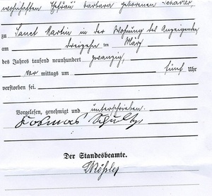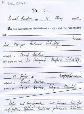 Sterbeurkunde des Fotografen Michael Schultz (geb. am 13. Juni 1894 in Sankt Martin). Verstorben am 13. März 1920 im Alter von 25 Jahren in Sankt Martin an den Spätfolgen einer im Ersten Weltkrieg erlittenen Verletzung. Ausgestellt vom Standesbeamten L. Rößler. Im Historischen Museum der Pfalz war vom 29.4.2014 bis 24.9.2017 die Ausstellung "1914 - 1918. Die Pfalz im Ersten Weltkrieg" zu sehen. Auf einen öffentlichen Aufruf hin meldeten sich zahlreiche Privatpersonen, ihre Objekte wurden in dieser Sammlung erfasst und z. T. auch in der Ausstellung gezeigt. Die Objekte befinden sich im Eigentum der Privatpersonen und sind nicht Teil der Sammlungen des Historischen Museums der Pfalz.
