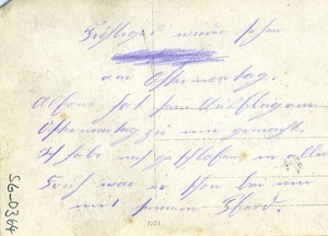Auf der Vorderseite: Schwarz/weiß Aufnahme zweier Soldaten, einer als Reiter. Auf der Rückseite: handschriftlicher Text. Transkription: "Fröhliges wieder sehen / am Ostermontag. / Alfons hat sein Ausflug am / Ostermontag zu mir gemacht. / Ich habe noch geschlafen, in aller / Früh war er schon bei mir / mit seinem Pferd." Im Historischen Museum der Pfalz war vom 29.4.2014 bis 24.9.2017 die Ausstellung "1914 - 1918. Die Pfalz im Ersten Weltkrieg" zu sehen. Auf einen öffentlichen Aufruf hin meldeten sich zahlreiche Privatpersonen, ihre Objekte wurden in dieser Sammlung erfasst und z. T. auch in der Ausstellung gezeigt. Die Objekte befinden sich im Eigentum der Privatpersonen und sind nicht Teil der Sammlungen des Historischen Museums der Pfalz.