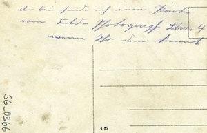 Auf der Vorderseite: Schwarz/weiß Aufnahme eines Feldfotografen. Abgebildet ist Michael Schultz (1894-1920). Der Fotograf mit Stahlhelm (Datierung deshalb ab 1916) sitzt mit Balgenkamera am Rand eines schützengrabenartigen Geländeausschnitts. Feldfotografen dokumentierten im Ersten Weltkrieg einzelne Frontabschnitte. Die in den rückwärtigen Stäben ausgewerteten Fotos dienten dann u.a. der Bewertung artilleristischer Ziele auf der gegnerischen Seite. Das Foto aus dem Nachlass von Michael Schultz stammt nicht direkt von ihm selbst, sondern von einem unbekannten Kameraden. Michael Schultz darf trotzdem als Urheber mitgelten, da das Foto offensichtlich auf seine Anregung und von ihm arrangiert angefertigt wurde. Auf der Rückseite: Unbeschrifteter Adressvordruck sowie handschriftlicher Text: "An bei sende ich eine Karte / vom Feld-Photografph Ldw. 4 / wenn Ihr den kennt.". (Herzlicher Dank für freundliche Hinweise zur Identifikation des Dargestellten ergeht an Herrn Gerhard Gerst aus Sankt Martin (Pfalz)) [Ludger Tekampe] Im Historischen Museum der Pfalz war vom 29.4.2014 bis 24.9.2017 die Ausstellung "1914 - 1918. Die Pfalz im Ersten Weltkrieg" zu sehen. Auf einen öffentlichen Aufruf hin meldeten sich zahlreiche Privatpersonen, ihre Objekte wurden in dieser Sammlung erfasst und z. T. auch in der Ausstellung gezeigt. Die Objekte befinden sich im Eigentum der Privatpersonen und sind nicht Teil der Sammlungen des Historischen Museums der Pfalz.