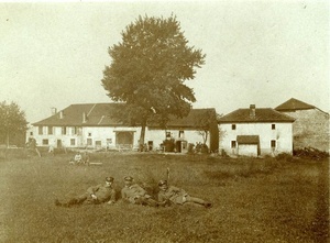 Auf der Vorderseite: Schwarz/weiß Aufnahme von drei Soldaten, die vor einem Bauernhof im Gras liegen. Auf der Rückseite: Unbeschrifteter Adressvordruck sowie handschriftlicher Text. Transkription "Ich befürcht dass sie / zum Jakob sagen er / ist noch nicht lange im / Felde. / Also wie Ihr denkt / Ich lass Jakob zuerst / ans Ruder. / Wens geht macht / es so wie ich schon / vorhehr erwhnte. / Was der Graf Georg / Euch vormachte, glaube / ich schon, aber dafür / muss er sich ein dum- / mer holen wie ich das / weis ich auch. / das ist die erste Aufnahme meines / neuhen Aparat. / sehr schön (hier sind wir) / Es wird mich sehr freuhen die Heimat zu sehen". Fotograf: Michael Schultz Im Historischen Museum der Pfalz war vom 29.4.2014 bis 24.9.2017 die Ausstellung "1914 - 1918. Die Pfalz im Ersten Weltkrieg" zu sehen. Auf einen öffentlichen Aufruf hin meldeten sich zahlreiche Privatpersonen, ihre Objekte wurden in dieser Sammlung erfasst und z. T. auch in der Ausstellung gezeigt. Die Objekte befinden sich im Eigentum der Privatpersonen und sind nicht Teil der Sammlungen des Historischen Museums der Pfalz.