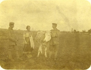 Auf der Vorderseite: Schwarz/weiß Aufnahme von zwei Soldaten, einer Bäuerin und einer Kuh. Auf der Rückseite: Unbeschrifteter Adressvordruck, unten: "Idel-Postkarte. Ica, Aktiengesellschaft, Dresden". Handschriftlicher Text Fotograf: Michael Schultz Im Historischen Museum der Pfalz war vom 29.4.2014 bis 24.9.2017 die Ausstellung "1914 - 1918. Die Pfalz im Ersten Weltkrieg" zu sehen. Auf einen öffentlichen Aufruf hin meldeten sich zahlreiche Privatpersonen, ihre Objekte wurden in dieser Sammlung erfasst und z. T. auch in der Ausstellung gezeigt. Die Objekte befinden sich im Eigentum der Privatpersonen und sind nicht Teil der Sammlungen des Historischen Museums der Pfalz.