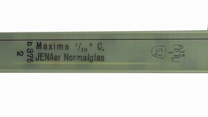 Das Thermometer ist in der original Aufbewahrungs-Papprolle mit Aufkleber des Drogisten eingelegt. Die Temperaturskala zeigt von 34,4 bis 42 Grad die Temperatur an. Auf der Rückseite ist in dem Außenglaskörper des Thermometers ein aufgerolltes Band mit den Buchstaben "DR" der Zahl 15 über und die Zahl 1 unter dem Band beschriftet. Unter dem Band ist ein Wappenschild mit der Nummer 52 aufgedruckt. Auf der Rückseite der Messskala steht "Maxim 1/10 ^ C. und darunter JENAer Normalglas". Quer zu dem Text steht "b 375 2" Quecksilber-Fieberthermometer erreichen diese Anforderungen, indem sich eine bestimmte Quecksilbermenge in einer sehr dünnen Kapillare ausdehnt. Die Anzeige der Maximaltemperatur wird durch einen in der Kapillare befindlichen Glasdorn erreicht, die sich bei Abkühlung zurückziehenden Quecksilberfaden abreißen lässt, wodurch die erreichte Maximaltemperatur weiter angezeigt wird. Zum Rückstellen muss der Glasdorn durch „Zurückschütteln“ oder Klopfen wieder an den Quecksilberfaden befördert werden.