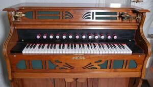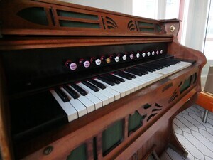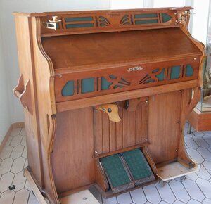 Einmanualiges Saugluft-Harmonium der Firma M. Hörügel, Leipzig: Baujahr um 1907 Umfang ,F bis f''' - Manualtrennung Bass: ,F bis e Diskant: f bis f''' Herstellerplakette: M. Hörügel. Leipzig Leutsch, danben 2 Plaketten zur Musikinstrumentenausstellung 1906 in der Berliner Philharmonie Seitlich je ein Tragegriff Seriennummer 13.273 Register: BASS: Bourdon 16' (in der Kontra-Oktave 8') Viola 4': (Ohne Plakette) Diapason 8' DISKANT: Dulcet 8' Melodia 8' Echo 8' - ist die leisere Variante von "Melodia". Dabei wird die Registerklappe nur minimal geöffnet; Flute 4': Clarninette 16': Sonstige Züge: Vox Humana (Drehflügeltremulant) Oktavkoppel im Bass 2 Kniehebel, links in der Funktion einer Orgelwalze und rechts wohl ein schweller (vorne und rückwärts) Stimmton a' = 438 Das Instrument wurde März/April 2020 durch die Harmoniumwerkstatt Klaus Langer, Grevenbroich restauriert und ist seither spielbar