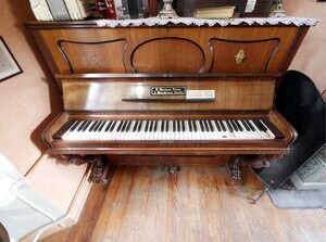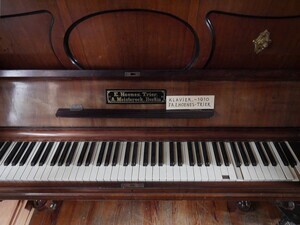 Klavier, ca. 1910, Fa. E. Hoenes Trier (Händler), A. Meistereck, Berlin Umfang A'' - a'''' Zwei Pedale (Dämpfung aufheben und Piano) Von den zwei Kerzenhaltern ist der linke verloren gegangen
