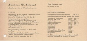Sechsseitiger seitlich auffaltbarer Flyer mit Beschreibungen von Bad Bodendorf, dem Sanatorium mit seinem Behandlungsangebot. In den Flyer sind eingelegt die Mitteilung, das Preisblatt für Privatpatenten (Signatur 1029_D_1-02) und wer nach dem Tod von Dr. Spitznagel die neue medizinische Leitung des Sanatoriums übernimmt (Signatur 1029_D_1-03).