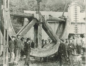 Schwarzweißfotografie. Diese Aufnahme aus dem Jahr 1906 zeigt einige Arbeiter der Sayner Hütte in Krupp´scher Zeit (1865-1926) neben einem großen Stator, der für das Elektrizitätswerk in Peking auf der Sayner Hütte gegossen wurde. Die abgebildete Rotorhälfte wurde am 18. Mai 1906 in der Sayner Hütte gegossen und wog 20.000 kg. Im Hintergrund ist das ehemalige Kanonenbohrwerk der königlich-preußischen Zeit (1815-1865) zu erkennen. Im Jahre 1769 beauftragt der letzte Kurfürst und Erzbischof von Trier, Clemens Wenzeslaus, Herzog von Sachsen (1739-1812), seinen Berginspektor Heinrich Daniel Jacobi (1725-1796), in Sayn bei Koblenz eine Eisenhütte zu erbauen. Die zu seinem Privatbesitz gehörenden Horhauser Gruben im Westerwald belieferten die Hütte mit Eisenerz. Als Folge des Wiener Kongresses erhält das Königreich Preußen das Rheinland als neue Provinz und übernimmt, neben den bereits bestehenden königlich-preußischen Eisenhütten in Gleiwitz (seit 1796) und Berlin (seit 1804), die Sayner Hütte am 1. Juli 1815. Im Jahre 1865 erwirbt der Essener Fabrikant Alfred Krupp (1812-1887) die Sayner Hütte, die unmittelbar am Rhein gelegene Mülhofener Hütte und die Horhauser Erzgruben (Gruben „Georg“, „Luise“ und „Friedrich-Wilhelm“). Die Krisenzeit nach dem 1. Weltkrieg trifft die mittelrheinischen Krupp´schen Hüttenwerke schwer: die Hermannshütte (Neuwied) wird 1925, die Sayner Hütte 1926 und die Mülhofener Hütte 1930, nach Inbetriebnahme des neuen Hochofenwerks in Essen-Borbeck 1929, stillgelegt. Heute gehört das Denkmalareal Sayner Hütte der Stadt Bendorf und wird seit einigen Jahren aufwendig saniert. Am 28. April 2017 wird das Besucherzentrum eröffnet und damit das Gelände für Besucher zugänglich sein.