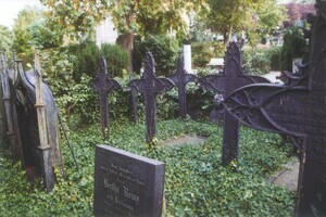 Farbfotografie. Diese Aufnahme zeigt das Gräberfeld der Familie Remy auf dem Friedhof in Bendorf an der Hauptstraße. Die abgebildeten gusseisernen Grabkreuze und Grabmal-Verzierungen im gotischen Stil wurden in der Sayner Hütte gefertigt. Die Grabkreuze und Grabmäler sind als Lithographien im Musterbuch 2 der Sayner Hütte abgebildet.