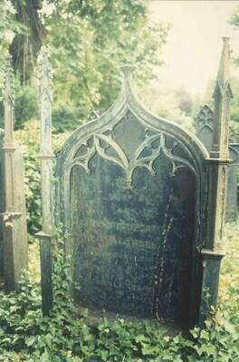 Farbfotografie. Diese Detailaufnahme zeigt ein einzelnes Grabmal im gotischen Stil im Gräberfeld der Familie Remy auf dem Friedhof in Bendorf. Das Grabmal wurde in der Sayner Hütte gefertigt und ist als Lithographie im Musterbuch 2 abgebildet.