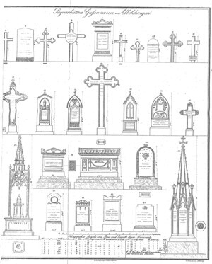 Farbfotografie. Diese Aufnahme zeigt die Grabstätte der Familie Remy auf dem Friedhof in Bendorf. Die abgebildeten gusseisernen Grabkreuze im gotischen Stil wurden in der Sayner Hütte gefertigt und als Lithographie im Musterbuch 2 abgebildet.