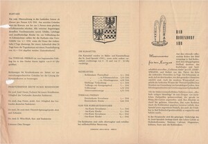 Flyer lang, dreiseitig, mit Beschreibung der Lage des Ortes in der Region. Die Quelle ist beschrieben mit chemischer Analyse der Anwendungsmöglichkeiten mit dem Wasser. Auf den letzten beiden Seiten sind die Kosten für Kurmittel, die Eintrittspeise für das Thermalschwimmbad und die Namen der praktizierenden Ärzte im Ort aufgeführt.