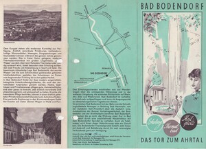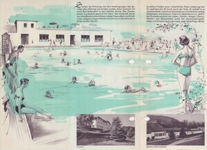 Flyer lang, dreiseitig, mit Beschreibung der Lage des Ortes in der Region. Im Innenteil ist das Thermalfreibad als Buntbleistiftzeichnung dargestellt und zwei Fotos zeigen das Kurhotel und das Kurhaus. Auf der Rückseite sind die Kurhausräume beschrieben und zwei Bilder vom Ort eingedruckt. der Prospekt enthält die Werte der Wasseranalyse von 1954 und die Preisliste für Kurmittelanwendungen.