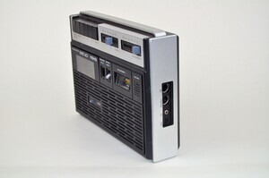 Tragbarer Kassettenrecorder von Saba aus dem Jahr 1977. Betriebsbereit ist der Recorder mit 6x 1,5 Volt Batterien, 220 V oder über einen separaten Anschluss mit 9 Volt. Dies handliche Reisegerät wurde 3 Jahre lang, von 1975 bis 1978 produziert. Alle wichtigen Bedienelemente, einschließlich dem Zugang zum Kassettenfach sind auf der Oberseite verbaut. Ebenso das eingebaute Microfon samt Aussteuerungspegel, einem Kippschalter für die Bandwahl und zwei Schieberegler für Lautstärke und Klangfarbe. Hinter der seitlichen Abdeckung befinden sich die Anschlüsse für Radio, Kopfhörer und ein externes Micro. Der Ladenpreis lag etwa bei 550 DM