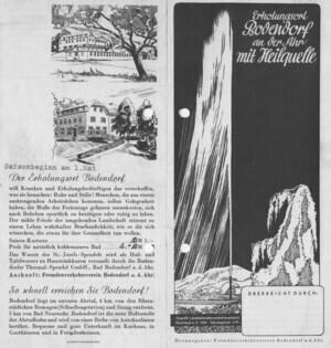 In dem Flyer werden die Vorzüge des Erholungsortes Bodendorf mit seiner Heilquelle beschrieben. Auf der letzten Seite wird der Preis für die Saison-Kurkarte und der Eintrittspreis für das Schwimmbad genannt.