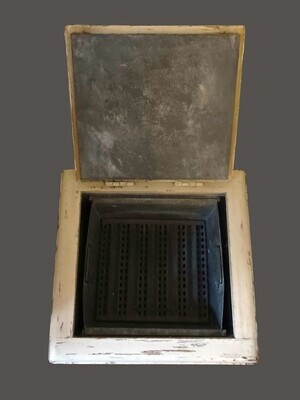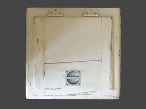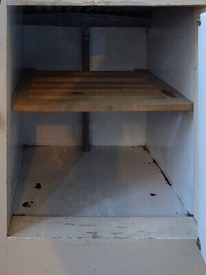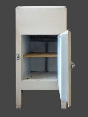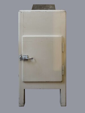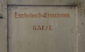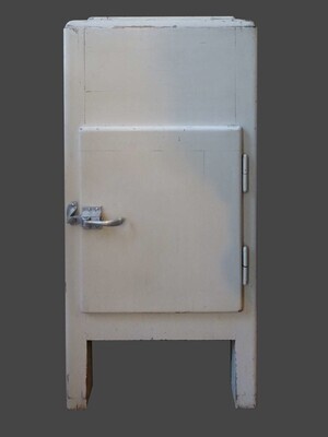 Eisschrank aus Tannenholz, weiß lackiert. Kühlfach: Buchenholzgitter und Emailleverkleidung. Eisfach: zinkverkleidet (innen) gelochtes Zinkblech.