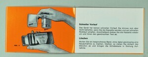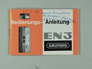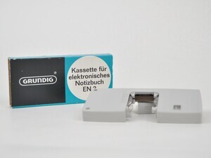 1964 - 1969 brachte Grundig das "Elektronische Notizbuch" EN 3 auf den Markt. Die auswechselbaren Kassetten hatten eine Aufnahmedauer von 2 x 22 Minuten. Mit einfacher Technik und ohne Anspruch auf Klangqualität eroberte das Gerät Büros, Praxen, Aussendienste etc. in kurzer Zeit. Das abnehmbare Microkopf dient gleichzeitig als LautsprecherZum Betrieb waren 3 x 1,5 Volt Batterien erforderlich. Als Zubehör gab es Kopfhörer und eine lederne Schutztasche. Der Preis 1964 lag bei 175 DM. Für unser Gerät sind noch Ersatzkassetten, der Schaltplan und die Bedienungsanleitung vorhanden.