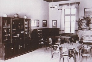 Schwarzweißfotografie. Diese Aufnahme aus dem Jahr 1908 zeigt einen Wohn- bzw. Aufenthaltsraum im Krupp'schen Erholungsheim in Sayn. Das aus Bruchstein errichtete Gebäude ließ Ferdinand Baron Bleul im Jahre 1839 als Maschinenfabrik und Gusswarenhandlung erbauen. Im Jahr 1872 verkaufte Ferdinand Bleul sein Unternehmen an die Firma Krupp, die zu dieser Zeit bereits Eigentümer der Sayner Hütte war. Anlässlich der Geburt ihres Sohnes Alfried stifteten Bertha und Gustav Krupp von Bohlen und Halbach den Angestellten der Krupp'schen Werke ein Erholungshaus in Sayn. Zu diesem Zweck wurden die Vordergebäude der ehemaligen von Bleul'schen Maschinenfabrik umgebaut und mit einer Terrasse versehen, die restlichen Fabrikgebäude wurden abgerissen und an deren Stelle eine Parkanlage angelegt. Bevor der Umbau begann musste ein Umzug der Maschinen in die neue, als Krupp'sche Halle bezeichnete Backsteinhalle auf dem Gelände der Sayner Hütte durchgeführt werden. Das Krupp'sche Erholungsheim für Werksbeamte wurde am 21. Mai 1909 eröffnet. Auf der linken Seite befand sich die Verkaufsstelle der Konsumanstalt, rechts wurde ein großer Speisesaal eingerichtet. 42 Einzelzimmer standen Erholungssuchenden zur Verfügung, dazu mehrere Aufenthaltsräume, ein Musikzimmer und die große Gartenanlage mit Wasserbecken, Springbrunnen und wasserspeiendem Eisbär. Während des Ersten und Zweiten Weltkrieges diente das Gebäude als Lazarett. 1952 verkaufte Krupp die Anlage an die Stadt Bendorf. Im Eingangsbereich des Gebäudes sieht man in dem Oberlicht über der Tür immer noch das Markenzeichen der Firma Krupp, die "Drei Ringe".