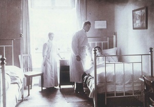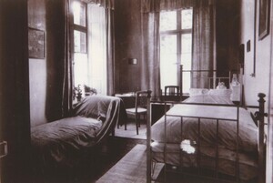 Schwarzweißfotografie. Diese Aufnahme aus dem Jahr 1914 zeigt einen Innenraum im Krupp'schen Erholungsheim in Sayn, welches während des Ersten und Zweiten Weltkrieges als Lazarett diente. Das aus Bruchstein errichtete Gebäude ließ Ferdinand Baron Bleul im Jahre 1839 als Maschinenfabrik und Gusswarenhandlung erbauen. Im Jahr 1872 verkaufte Ferdinand Bleul sein Unternehmen an die Firma Krupp, die zu dieser Zeit bereits Eigentümer der Sayner Hütte war. Anlässlich der Geburt ihres Sohnes Alfried stifteten Bertha und Gustav Krupp von Bohlen und Halbach den Angestellten der Krupp'schen Werke ein Erholungshaus in Sayn. Zu diesem Zweck wurden die Vordergebäude der ehemaligen von Bleul'schen Maschinenfabrik umgebaut und mit einer Terrasse versehen, die restlichen Fabrikgebäude wurden abgerissen und an deren Stelle eine Parkanlage angelegt. Bevor der Umbau begann musste ein Umzug der Maschinen in die neue, als Krupp'sche Halle bezeichnete Backsteinhalle auf dem Gelände der Sayner Hütte durchgeführt werden. Das Krupp'sche Erholungsheim für Werksbeamte wurde am 21. Mai 1909 eröffnet. Auf der linken Seite befand sich die Verkaufsstelle der Konsumanstalt, rechts wurde ein großer Speisesaal eingerichtet. 42 Einzelzimmer standen Erholungssuchenden zur Verfügung, dazu mehrere Aufenthaltsräume, ein Musikzimmer und die große Gartenanlage mit Wasserbecken, Springbrunnen und wasserspeiendem Eisbär. Während des Ersten und Zweiten Weltkrieges diente das Gebäude als Lazarett. 1952 verkaufte Krupp die Anlage an die Stadt Bendorf. Im Eingangsbereich des Gebäudes sieht man in dem Oberlicht über der Tür immer noch das Markenzeichen der Firma Krupp, die "Drei Ringe".