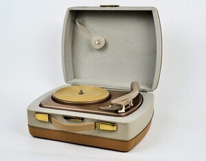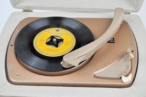 Ein kleiner, handlicher Plattenspieler der in den Jahren 1959/1960 als transportables Gerät im Koffer produziert wurde. Die Stromversorgung erfolgt ausschließlich über 220 Volt. Eine Endstufe ist nicht eingebaut, so dass zum Platten hören entweder ein Kopfhörer oder ein Verstärker erforderlich ist. Es stehen insgesamt vier Geschwindigkeiten zur Verfügung. 16 / 33 / 45 und 78 UpM. Nahezu unbekannt ist die 16er Drehzahl. Sie wurde gebraucht für reine Sprachaufnahmen ohne große Qualitätsansprüche. ( Fernlernkurse, Sprache, Märchenplatten) Die Anschlüsse für Strom und für den Verstärker sind hinter einer Abdeckung auf der Rückseite zugängig. Für ca. 120 € konnte das Gerät erworben werden.