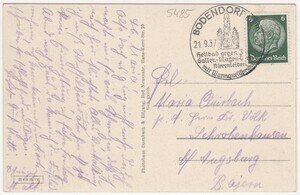 Postalisch gelaufene Ansichtskarte im Graudruck. Aufgenommen kurz nach der Eröffnung stehen als einzige Gebäude das Bademeisterhaus mit Toilettenanlage und links daneben einige Badekabinen. Die Rückseite ist beschrieben, mit einer 6 Pfennig Briefmarke Motiv "Hindenburg" beklebt und abgestempelt am 21.9.1937 mit dem Poststempel Bodendorf.
