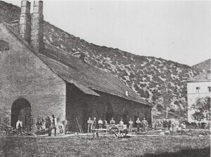 Schwarzweißfotografie. Diese Aufnahme zeigt die von der Bendorfer Fabrikantenfamilie Remy gegründete Eisenhütte in Alf an der Mosel. Es handelt sich um eine Eisenfrisch- und Walzhütte nach englischer Methode.