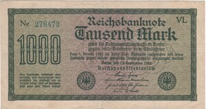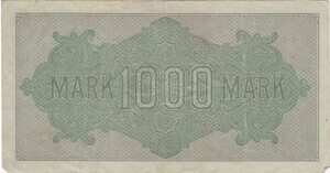 Schein ist auf weißem Papier gedruckt. Das Textfeld ist in einem breiten Rahmen eingefaßt. Im Rahmen stehen der Wert als Zahl und Wort, die Schein-Nr mit Buchstaben-Code, den Hinweis "zahlt die Reichsbankkasse in Berlin gegen diese Banknote dem Einlieferer”, darunter Ort und Datum der Herausgabe, die Unterschriften des Reichsbankvorstandes und neben den Unterschriften zwei Siegel der Reichsbank gedruckt. Auf der Rückseite steht in einem grün gehaltenen Feld der Wert 1000und links und rechts der Zahl das Wort "MARK".
