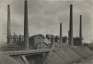 Schwarzweißfotografie. Diese Aufnahme zeigt die Sprengung des Hochofengebäudes der Mülhofener Hütte im Jahr 1933/34. Im Jahr 1856 wurde die Mülhofener Hütte nach Plänen von Karl Ludwig Althans vom preußischen Staat so zu sagen als modernes Hochofenwerk der Sayner Hütte unmittelbar am Rhein erbaut. Das Gelände diente seit kurtrierischer Zeit als Schiffanlegeplatz der Sayner Hütte. Der Hochofen der Sayner Hütte wurde schließlich ausgeblasen und fortan nur noch in der Mülhofener Hütte das Roheisen produziert, während die Sayner Hütte als reiner Gießereibetrieb fortgeführt wurde. 1865 erwarb Alfred Krupp zusammen mit der Sayner Hütte und drei Eisensteingruben bei Horhausen die Mülhofener Hütte. Es wurden dort drei neue Hochöfen mit einer Tagesleistung von je 35 Tonnen Roheisen unter einem Kostenaufwand von 650 000 Talern erbaut. Später folgte noch ein vierter. Durch den weiteren Ausbau und die Modernisierung wurde die Tagesleistung der vier Hochöfen schließlich auf 300 Tonnen gesteigert. Lange Zeit hat die Mülhofener Hütte in der Versorgung der Gußstahlfabrik mit Roheisen eine bedeutende Rolle gespielt. Noch zu Lebzeiten von Alfred Krupp zeigte sich jedoch, daß die Krupp-Hüttenbetriebe den wirtschaftlichen Anforderungen nicht mehr entsprachen. Die weite Entfernung von Essen erforderte sehr hohe Frachtkosten. Die Betriebseinrichtungen waren veraltet, und der Roheisenbedarf für die Massenfabrikation stieg erheblich an. Das großzügige und neuzeitliche Hochofenwerk in Rheinhausen lieferte ab Ende 1897 das gesamte für die Gußstahlfabrik und die Außenwerke erforderliche Roheisen. Nur für die Erzeugung von Spezialroheisensorten, wie Qualitäts- und Puddeleisen, sowie für Spiegeleisen und Ferromangan, blieb die Mülhofener Hütte bestehen. Außerdem stellte sie aus Hochofenschlacke Schlackenwolle her. Die Mülhofener Hütte wurde am 6. Juni 1930 stillgelegt. Heute befindet sich auf dem Gelände die Firma Kann Beton GmbH.