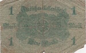 Scheine sind im unterschiedlichen Erhaltungszustand und in mehreren Druckfarben. Vorderseite: Ein Schein ist in Grün und der Reichsadler unten links in Rot gedruckt. Als Dekor ist eine, Ziselieren in Grüntönen. Oben ist die Scheinnummer in Rot eingeprägt. Links und rechts in einem grünen Kreis die Wertangabe 1 Mark gedruckt. In der Mitte das Wart Darlehnskassenschein, darunter die Wertangabe als Wort und darunter das Herausgabedatum in einem grünen Feld mit den Unterschriften des Reichsbankdirektoriums. Die Rückseite ist bei einem Schein in grün gedruckt. Die Wertangabe als Wahl in allen vier Ecken gedruckt und in der Mitte untereinander das Wort Darlehnskassenschein, der Reichsadler und der Wert als Worte gedruckt.