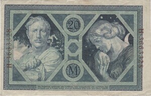 Schein in Druckfarben schwarz-grün und rot. Vorderseite: In einem Druckteppich links und rechts eine Pflanze gedruckt, die vom Reichsbankwappen ausgeht und die Zahl 20 enthält und unten die Scheinnummer.. Im Mittelteil oben in einem rechteckigen Feld ein Kreis mit Kaiseradler und der Zahl 20. Auf beiden Seiten des Kreises Männer, die aus einem Füllhorn Münzen ausschütten. Im Feld darunter untereinander Reichsbanknote, Wert als Zahl, Text "zahlt die Reichsbankhauptkasse gegen diese Banknote den Einlieferer", das Herausgabedatum des Scheins und die Unterschriften das Reichsbankdirektoriums. Rückseite: In einem Druckteppich in einem Achteck links ein Männerportait und Rechts ein Frau, die den Kopf auf die Hände abstützt. In der Mitte oben und unten ein Kreis; oben mit der Zahl 20 und unten der Buchstabe M.