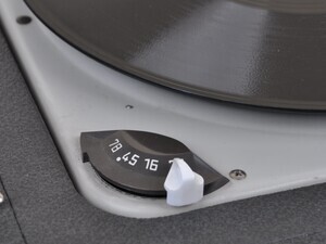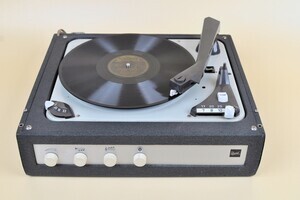 Relativ schweres Gerät mit Holz Chassis mit Lederimitat 10er Wechsel aus den Jahre 1962. Geschwindigkeiten 16/33/45und 78 UpM mit Duchmesser17/20/25 und 30 cm. Der Deckel beinhaltet einen Lautsprecher, der Verstärker im Chassis verbaut. Anschlüsse für externe Geräte und Lautsprecher sind an der Rückseite zu finden. An der Vorderseite befinden sie die Drehschalter zur Bedienung von Ein/Aus/ Lautstärke und die Höhen/Tiefen Einstellungen. Im Kopfträger sind 2 unterschiedliche Magnetnadeln in einer Einheit verbaut. Horizontal um die eigene Achse drehbar, kann zwischen der Stellung N (für 78er) und die Stellung M (für die 45er bzw 33er) Platten gewählt werden.